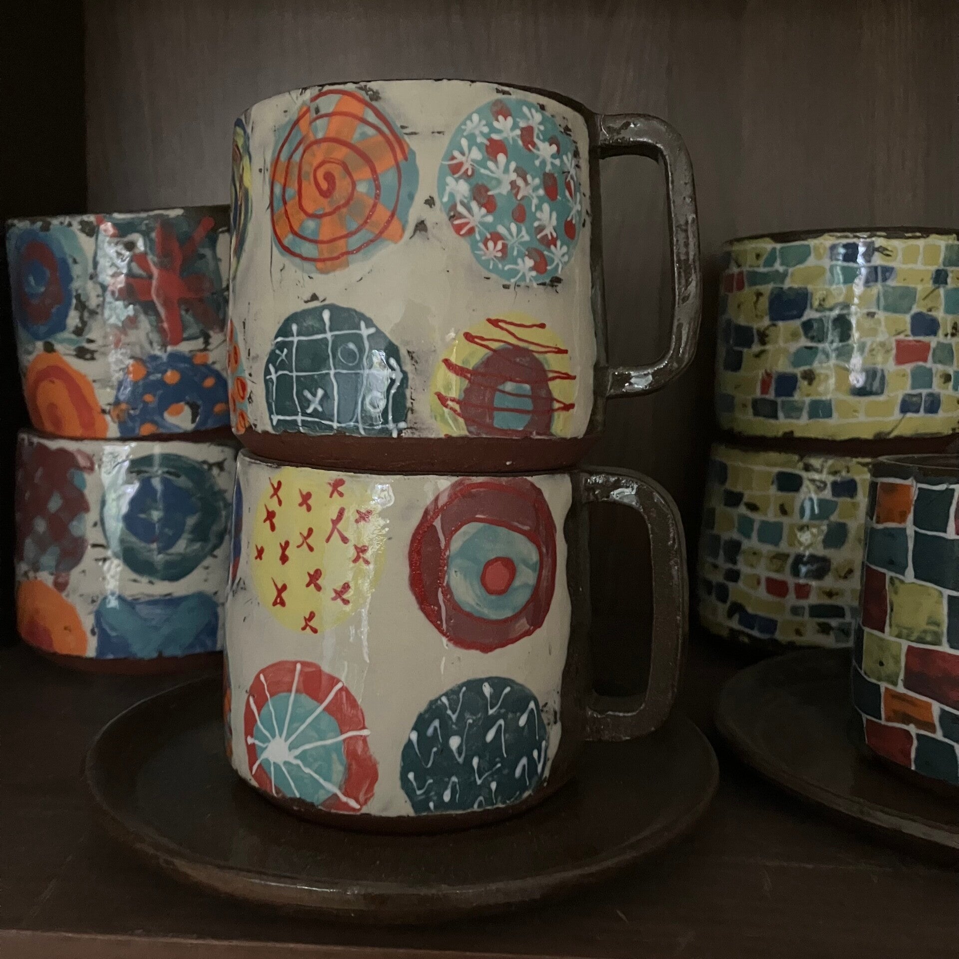 Kop met monoprint slibdecoratie, verschillende prints